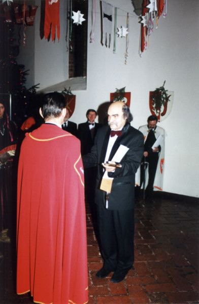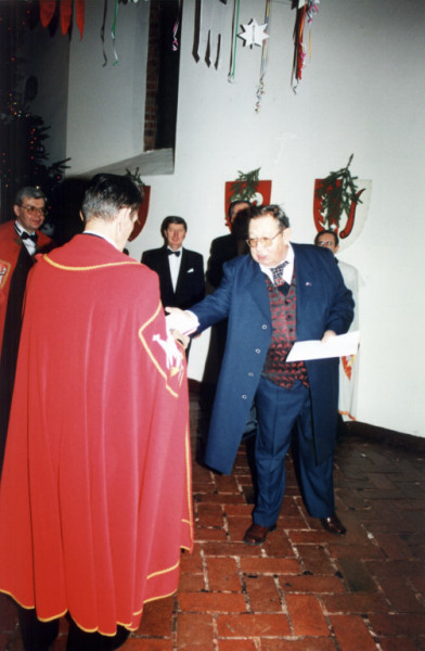 wypełnił wnętrza zamkowe. Widowisko to stało się wstępem do najbardziej podniosłej uroczystości wieczoru. Przed zebranymi gośćmi balu ukazali się, odziani w czerwone, rycerskie płaszcze, gospodarze: kasztelan Zygmunt Kwiatkowski i honorowy rycerz Zamku Golubskiego, sędzia Jerzy Żuralski. Towarzyszyli im obecni na balu inni honorowi rycerze, wymienieni już wcześniej.