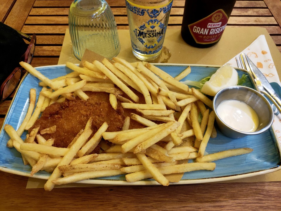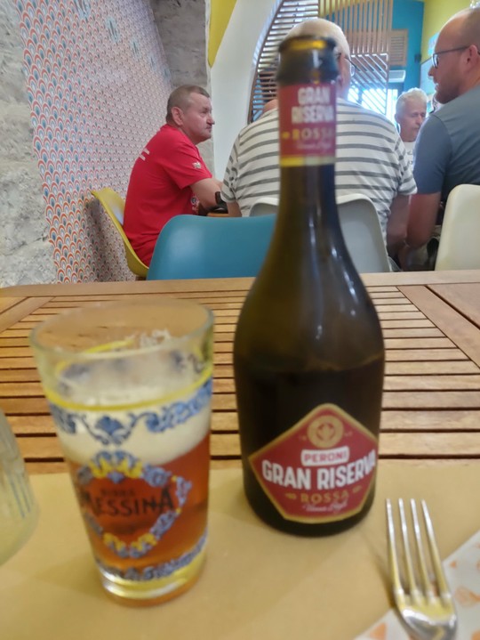 Ponieważ zbliżała się pora obiadowa postanowiliśmy pójść do znanej z przewodników turystycznych restauracji Sea Chef, oferującej podobno najlepsze rybne potrawy w tym regionie Italii. Dość szybko odnaleźliśmy ten lokal i wchodząc doń zobaczyliśmy, że nie jesteśmy pierwsi spośród uczestników naszego rajdu. Fama o dobrym jedzeniu potwierdziła się. Moja smażona ryba była wyśmienita, podana z frytkami oraz sosami do wyboru zaspokoiła moje oczekiwania. A do tego podano schłodzone piwo Peroni Gran Riserva... Wracając do hotelu, niestety pod górę i w popołudniowym skwarze, wszystkie moje kulinarne zachwyty przeobraziły się w chęć jak najszybszego dotarcia do miejsca naszego pobytu i odpoczynku w pozycji horyzontalnej. Po półgodzinnej wędrówce mojemu marzeniu stało się zadość. Nie było w sumie tak źle, jak to opisałem, bowiem cały czas towarzyszyli mi Ewa i Maciej. I było miło. Wieczorem w hotelowym patio swoje kulinarne mistrzostwo kolejny raz pokazał mój siostrzeniec. I tak zakończył się dzień, w którym daliśmy odpocząć nie tylko sobie, lecz także motocyklom i busowi. Co przyniesie następny dzień, ano zobaczymy.