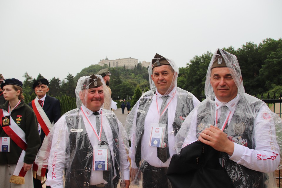 Oglądając się do tyłu miałem widok na miejsca zajmowane przez pozostałych uczestników uroczystości i drogę prowadzącą na Polski Cmentarz Wojenny. Zwieńczeniem tego widoku był leżący najwyżej klasztor i bazylika św. Benedykta