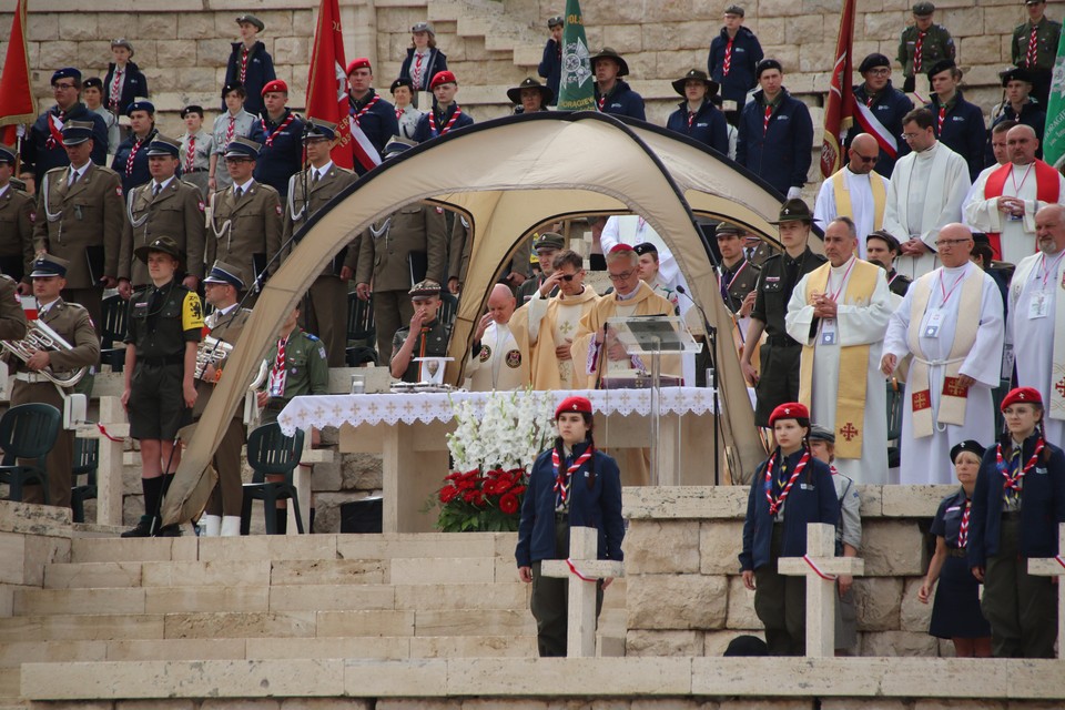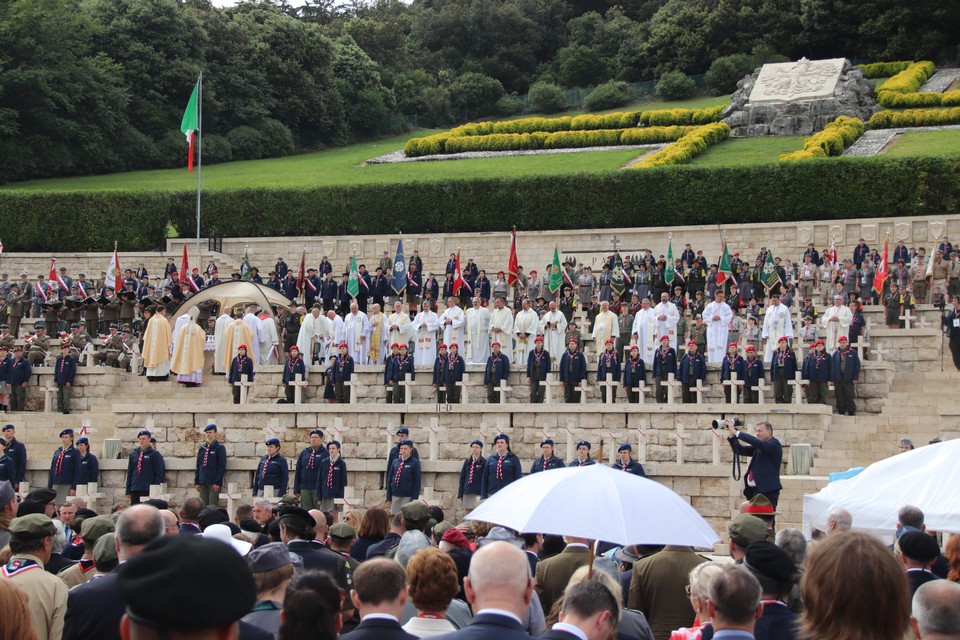 prezydenta Andrzeja Dudę wraz z małżonką Agatą. Zostali oni powitani u stóp Polskiego Cmentarza Wojennego przez przedstawicieli duchowieństwa mającego niebawem odprawić Mszę świętą. Następnie para prezydencka i towarzyszące im osoby przeszły wzdłuż rzędów zajętych przez weteranów walk o Monte Cassino, kombatantów i ich rodziny, a także przez generalicję i wyższych oficerów Wojska Polskiego wybranych do uczestnictwa w tych uroczystościach i zasiadły w pierwszych rzędach aby uczestniczyć w Eucharystii.