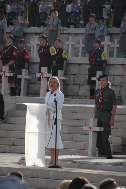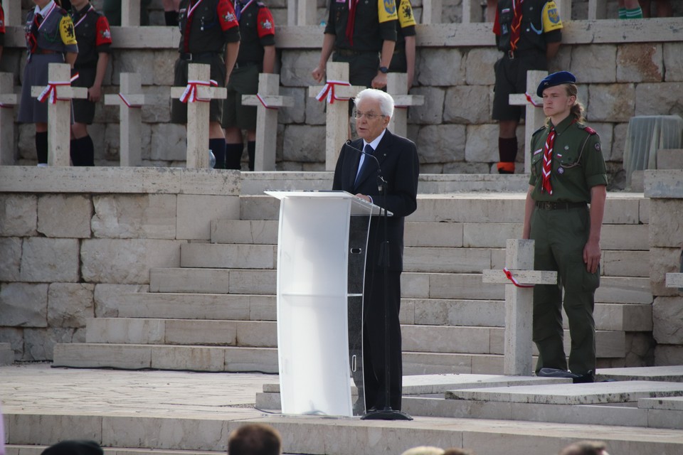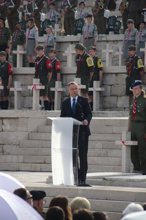 Po Mszy świętej odegrano hymny Rzeczypospolitej Polskiej i Republiki Włoskiej w ten sposób zaznaczając przejście od części duchowo-religijnej do części oficjalnej państwowej. Nastąpiło powitanie gości przez szefa Urzędu do Spraw Kombatantów i Osób Represjonowanych Lecha Parella, przede wszystkim prezydentów obu państw Andrzeja Dudę i Sergio Mattarella (tu wtrącę, że ten ostatni nie uczestniczył w Mszy świętej i przyleciał helikopterem już po jej zakończeniu). Następnie głos zabrał prezydent