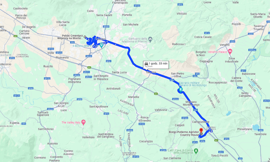 bardziej góry niż wzgórza przypominało naszą polską agroturystykę. Śniadanie może nie było tak wykwintnie podane jak w hotelach, w których ostatnio nocowaliśmy ale smakowało nieźle. Jedynym mankamentem było to, że po każdą szklankę herbaty czy kawy trzeba było zgłaszać się do gospodarza tego obiektu, a ten osobno podawał każdemu z nas, co wydłużało poranny posiłek. A musieliśmy się spieszyć, bowiem ze względów bezpieczeństwa uczestnicy biorący udział w uroczystościach na Polskim Cmentarzu Wojennym na Monte Cassino, mogli wjechać tam tylko do godziny 11 i to podstawionymi w mieście Cassino wojskowymi busami.