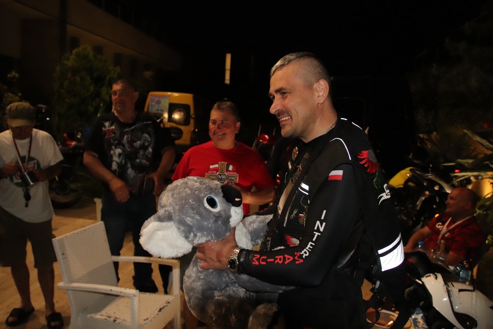fasolka po bretońsku), suto i wesoło. Tak się złożyło, że w tym dniu przypadały urodziny komandora VII rajdu Monte Cassino Intermarium, prezesa Stowarzyszenia Motocyklowego pod wspomnianą wyżej nazwą – mecenasa Artura Sobótki. W prezencie od uczestników rajdu otrzymał on niemałej wielkości maskotkę –