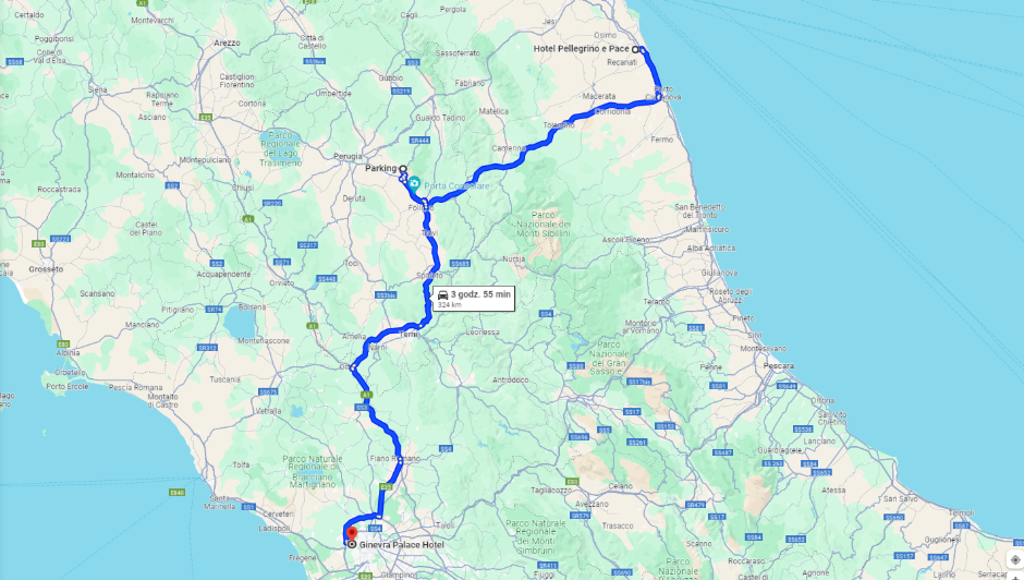 Czekała na nas trasa wiodąca co prawda autostradami lecz bardzo ruchliwa, powodująca wydłużenie się czasu podróży do około 2,5– 3 godzin. Na miejsce, to znaczy do Ginevra Palace Hotel, leżącego nieco na uboczu od centrum Rzymu przyjechaliśmy jeszcze za dnia.