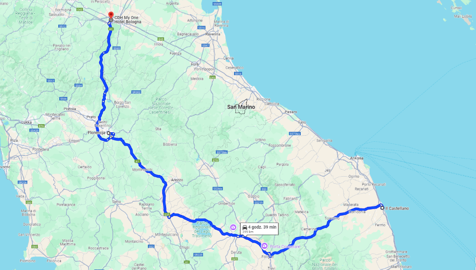 Trasa z Florencji do Bolonii przecinała licznymi tunelami masyw Apeninów. Najdłuższy z tuneli liczył sobie kilkanaście kilometrów i przejazd był – przynajmniej dla mnie – bardzo emocjonujący. Jeszcze za dnia dojechaliśmy do miejsca naszego zakwaterowania, czyli CDH My one Hotel, leżącego nieco na uboczu, a właściwie na peryferiach Bolonii.