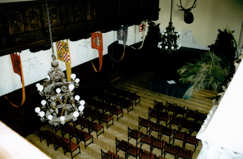 Oglądaliśmy więc sypialnię książęcą z łożem pod baldachimem w kolorze złoto-brązowym oraz buduar wraz z tajemniczymi schowkami i łazienkę książęcą. Na czas Warsztatów komnata ta była oddana w posiadanie Zofii Markiewicz i Macieja Sławińskiego, chyba w podziękowaniu za wytrwałość w bywaniu na tego typu imprezach. Przy okazji dopowiem, że Maciej podczas wieczornego, piątkowego spotkania robił użytek z akordeonu, który przywiózł ze sobą, grając akompaniament do różnych pieśni biesiadnych.