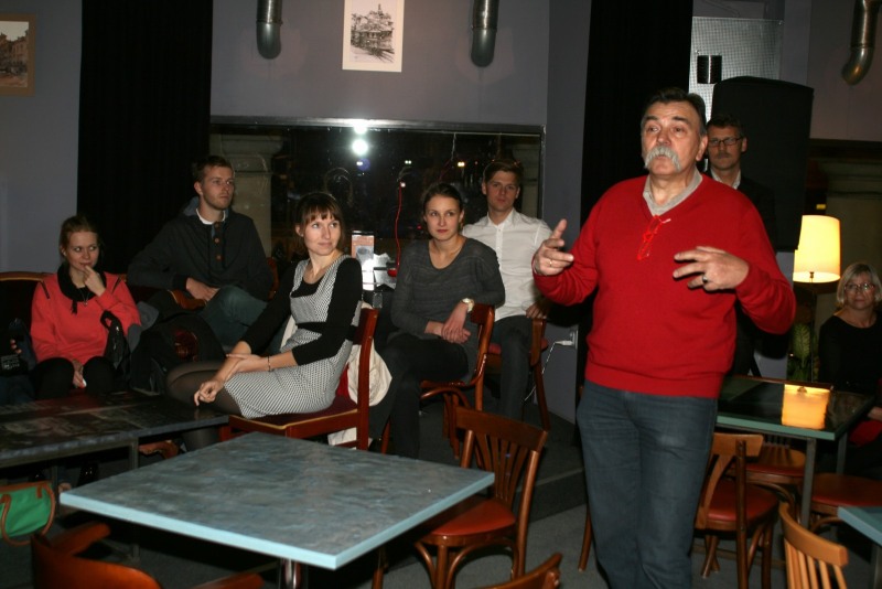 Wernisaż zainaugurował Edward Dargiewicz – gospodarz galerii i spiritus movens wielu wydarzeń artystycznych w tym miejscu. Osoba niezwykła (chyba poświęcę p. Edwardowi osobne miejsce w mojej witrynie), otwarta na różnorakie działania kulturalne. W kilku zdaniach przywitał zgromadzoną publiczność i samego bohatera spotkania, a także dosłownie w kilku słowach scharakteryzował miejsce imprezy – kawiarnia, scena, koncertownia i trochę galeria. Jak sam przyznał w krótkiej rozmowie ze mną: Funky Studio to taki port docelowy w którym mógłbym otoczyć się fajnymi, młodymi twórcami, żeby było miejsce wymiany myśli i poglądów nie tylko na temat sztuki. Żeby kawiarnia była trochę jak „wczesna” Jama Michalika w Krakowie [którą często odwiedzał, będąc studentem szkoły teatralnej – dopisek KB]. Na górze coś jak dom kultury ale nie zajęcia pozalekcyjne, tylko taki dom, gdzie kultura mieszka na co dzień i czuje się jak w domu.